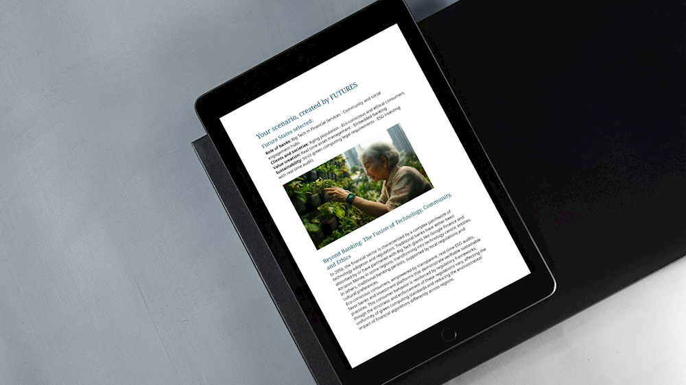 Tauchen Sie ein in Zukunftsszenarien, die mithilfe generativer KI entwickelt und von unseren Innovationsexpertinnen und -experten validiert werden. Entdecken Sie in vertiefenden Workshops die künftige Facetten und Perspektiven für Ihr Finanzinstitut.
